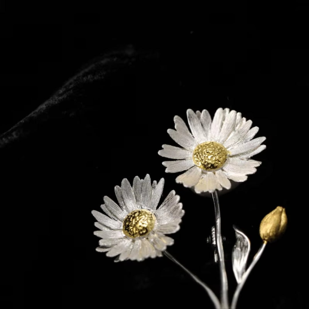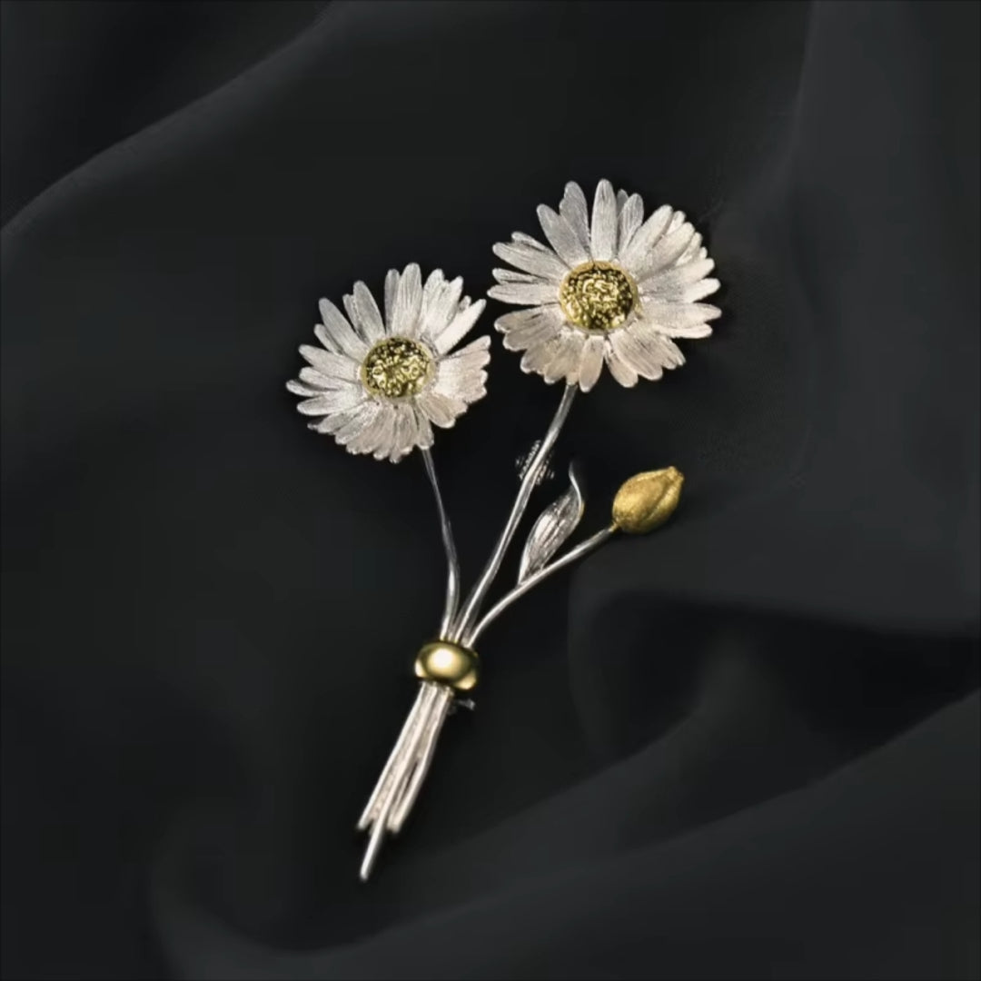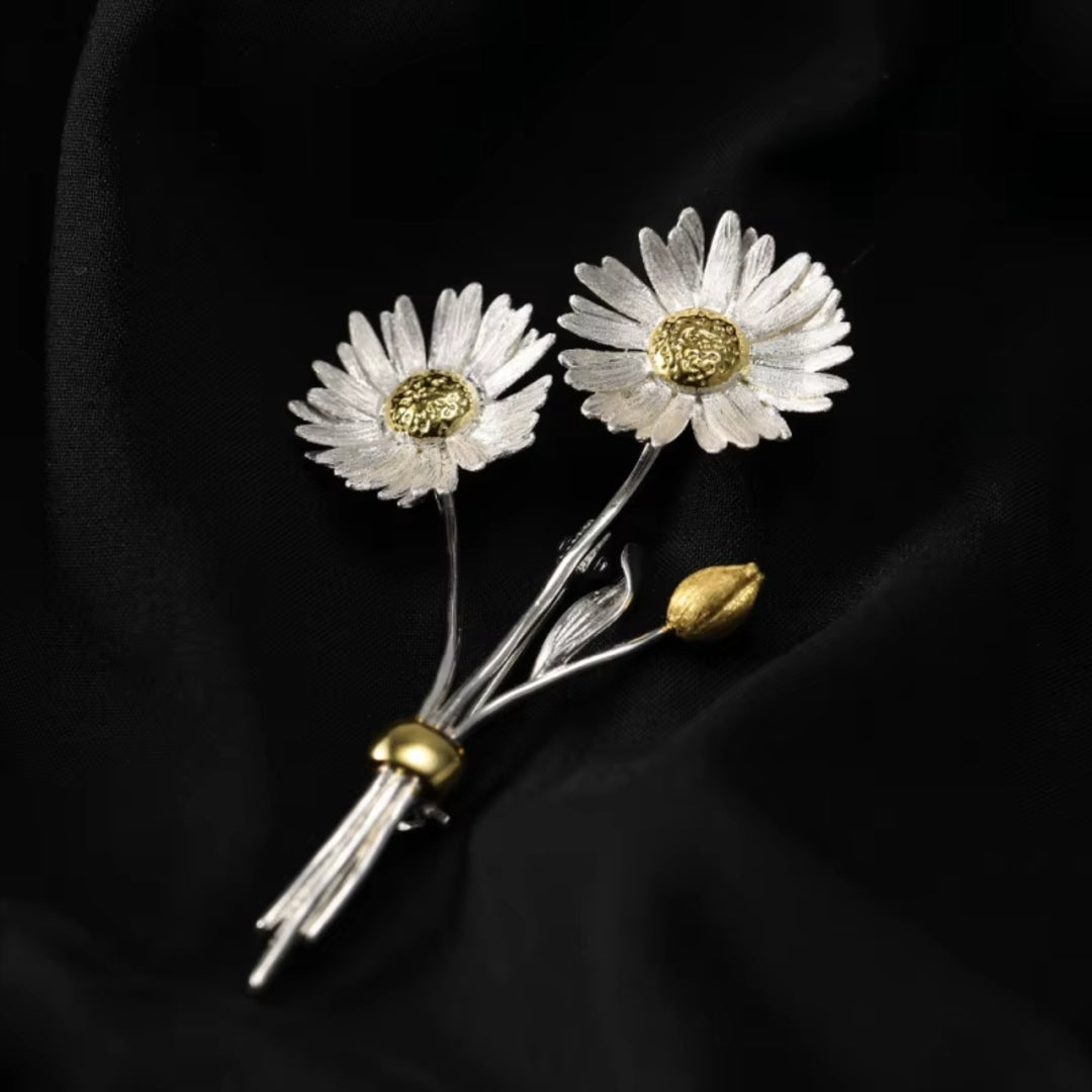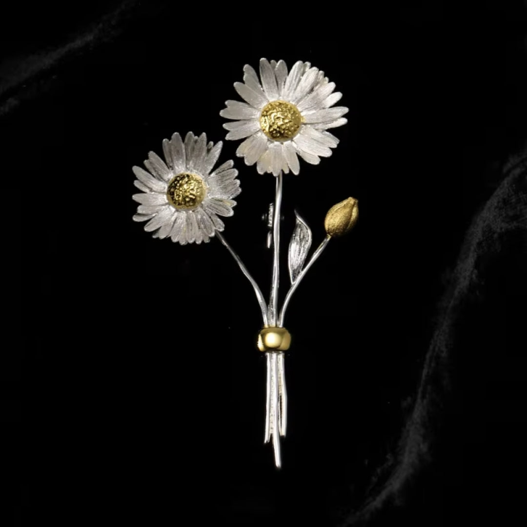 Brooch With Chamomile Flowers In 925 Sterling Silver 18K Gold Plated Handcrafted Floral Fine Jewelry