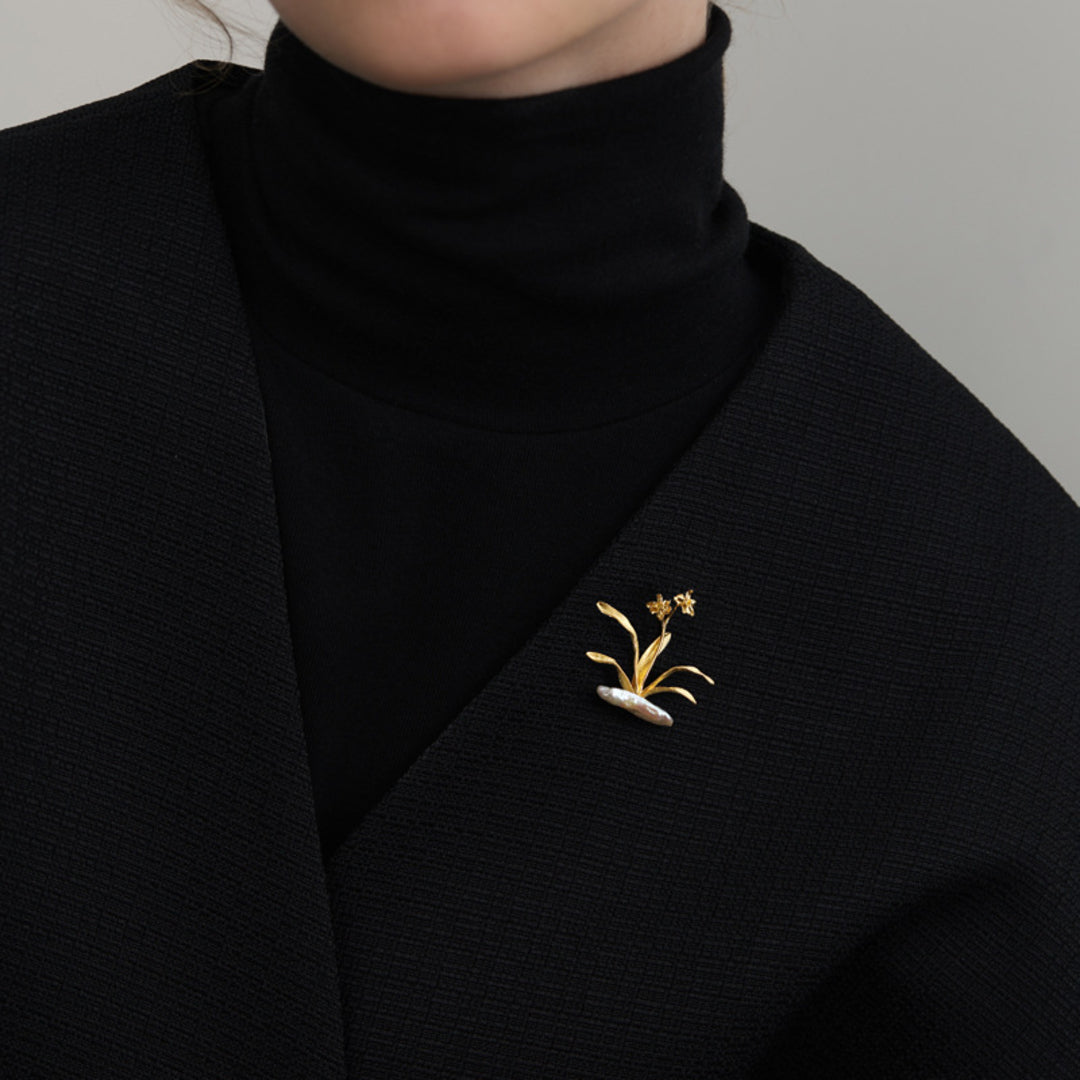 Daffodil Brooch With Baroque Pearl In 925 Sterling Silver With 18K Gold Plating Handcrafted Fine Jewelry Design