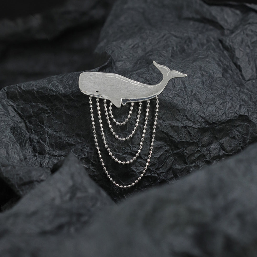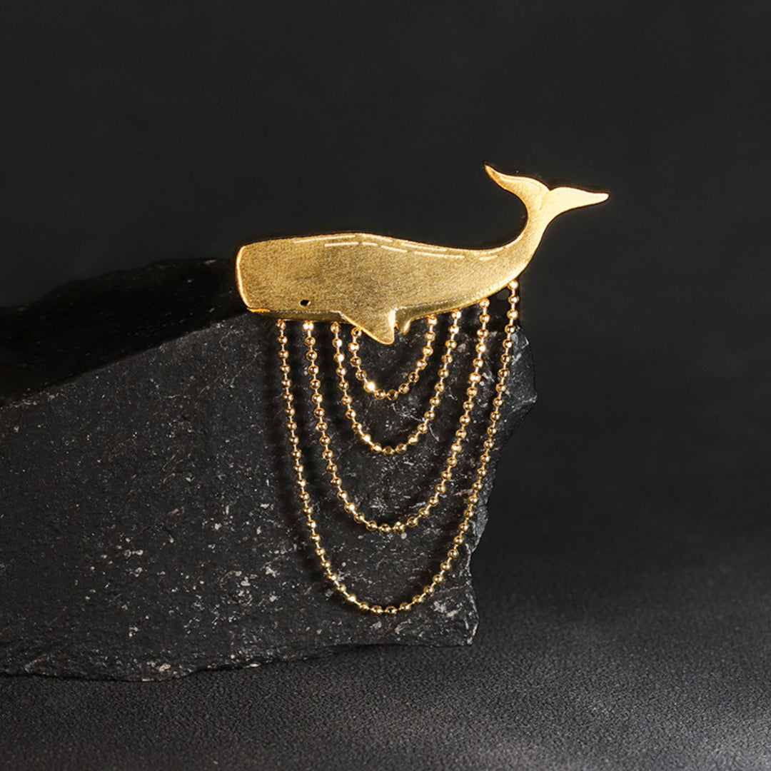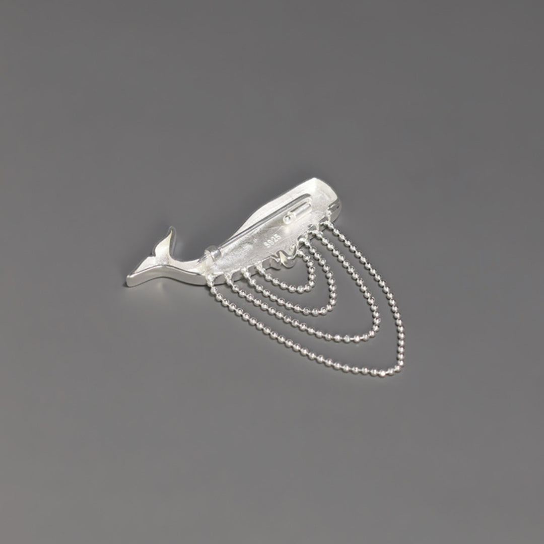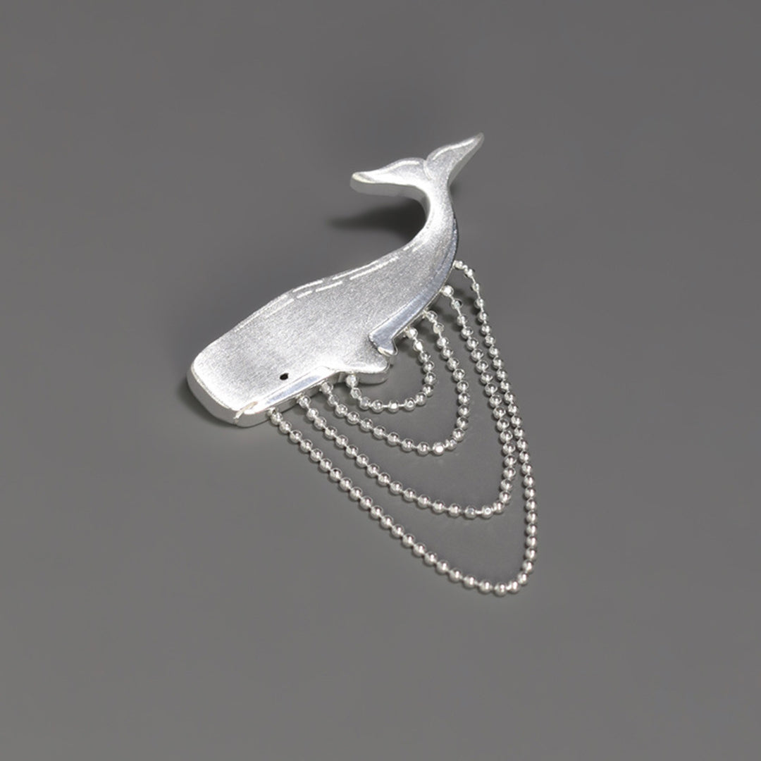 Our Sperm Whale brooch is a modern jewelry design that captures the typical voluminous shape of this ocean creature, with a tassel of ball chains crafted in a way that beautifully depicts the water movement by creating a dynamic impression of its graceful motion. The piece is handcrafted in 925 sterling silver and is optionally available with an 18K gold plating. Whether worn on a lapel, dress or blouse, the brooch adds a touch of elegance and individuality to your look. For lovers of nature-inspired jewelry with a maritime motif, this piece might become a favorite addition to their collection.