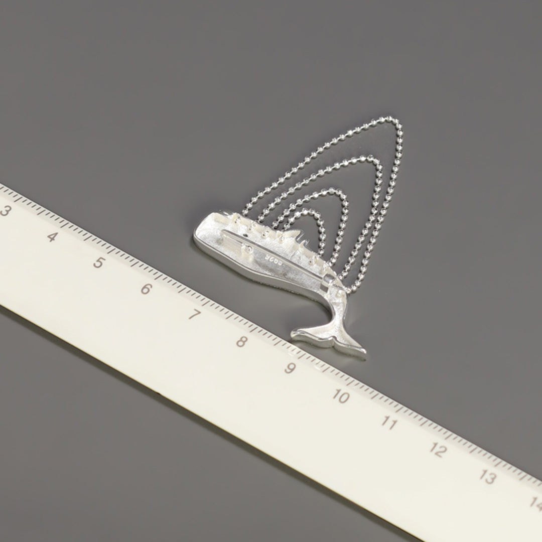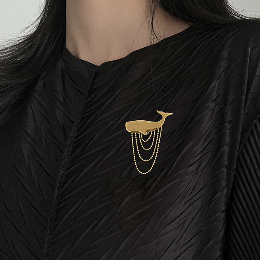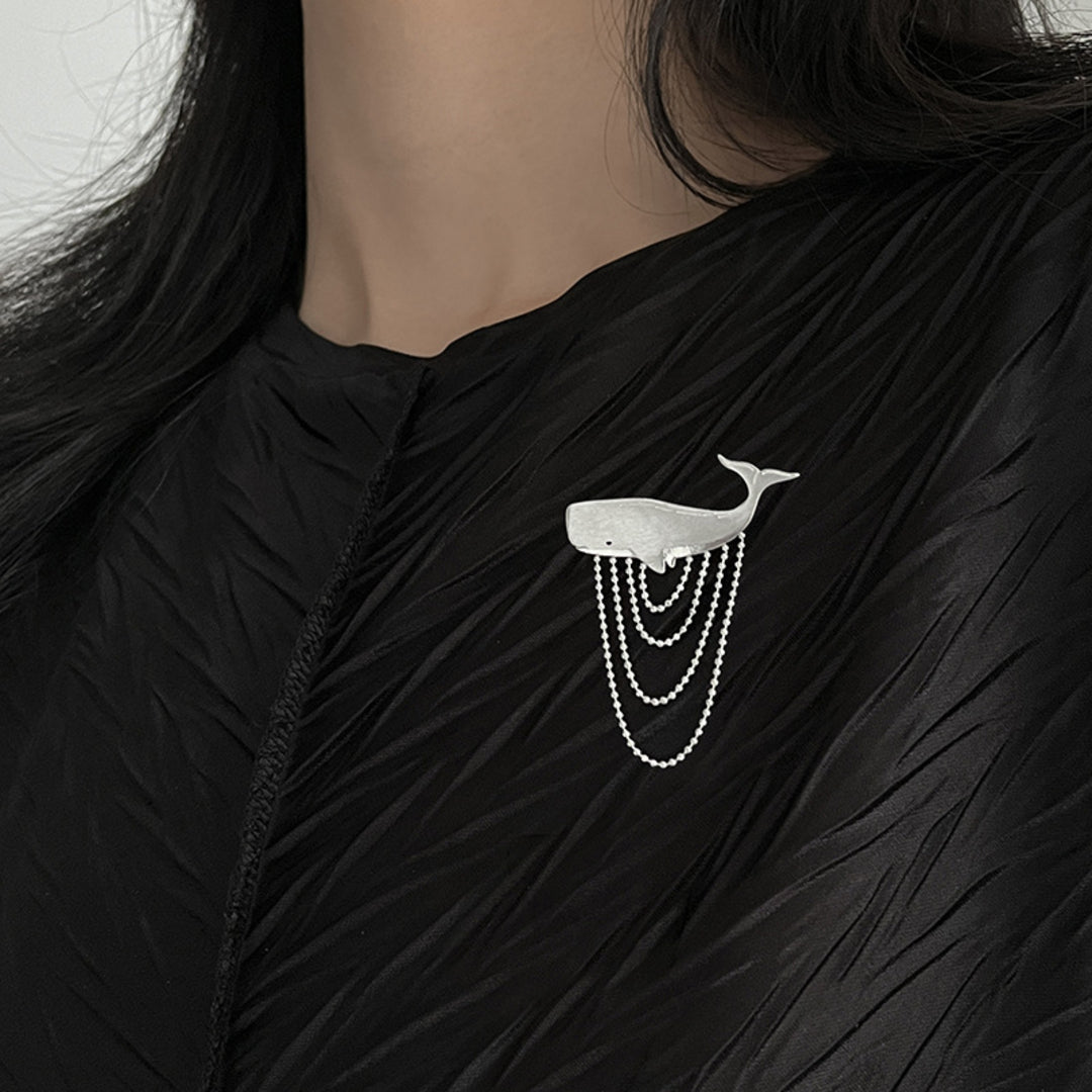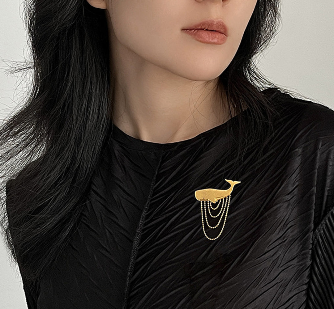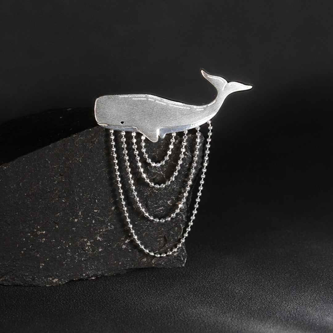 Our Sperm Whale brooch is a modern jewelry design that captures the typical voluminous shape of this ocean creature, with a tassel of ball chains crafted in a way that beautifully depicts the water movement by creating a dynamic impression of its graceful motion. The piece is handcrafted in 925 sterling silver and is optionally available with an 18K gold plating. Whether worn on a lapel, dress or blouse, the brooch adds a touch of elegance and individuality to your look. For lovers of nature-inspired jewelry with a maritime motif, this piece might become a favorite addition to their collection.